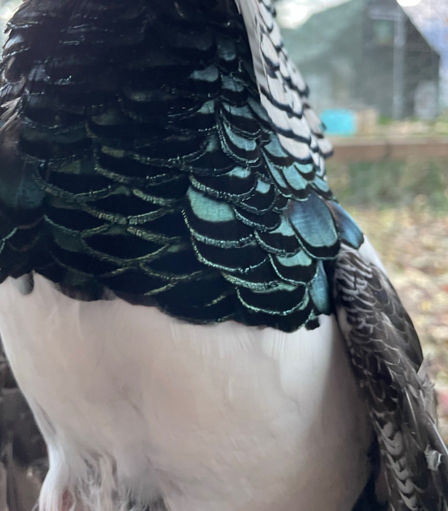 La mantellina, che si presenta molto ampia ed arrotondata, è composta da penne bianche con orlature nere cangianti in verde che gli danno un aspetto squamato.