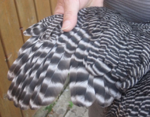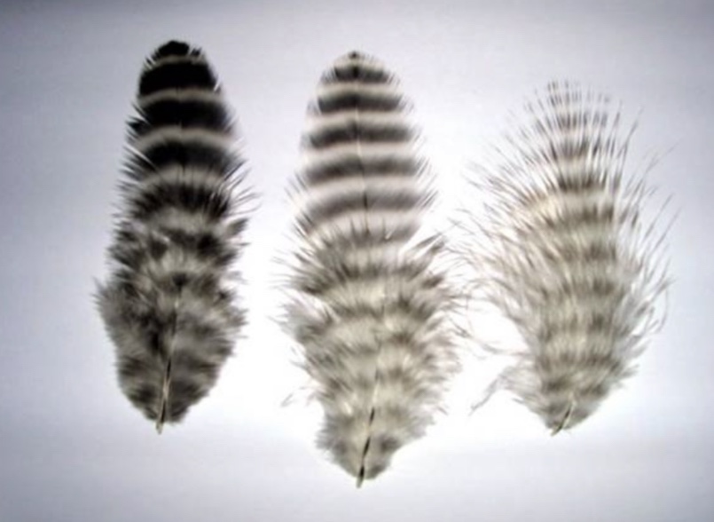 Le barre sono costituite dal colore di base nero e dalle barre bianche, questo è importante e dovrebbe essere ricordato da tutti quando si parla di barratura, anche su altre razze. Dimentica tutto ciò che sta succedendo sugli standard che indicano colori fantasiosi come azzurro cielo, blu-grigio, ecc. Come già accennato le barre sono bianche, sul pollo vivo sono visibili solo le ultime barre, quella che ci appare grigio-azzurra è solo la piuma sottostante e il colore di base nero, cambia otticamente le barre bianche e dunque le piume appaiono nella parte bianca grigio-blu, dunque è solo un’illusione ottica. La barratura è più dritta possibile anche sopra il rachide della piuma, anch’essa disegnata. Il colore di base nero intenso deve separarsi nettamente dalle barre bianche e non deve essere sfumata. Il rapporto tra il colore di base e le barre è 1:1 nel gallo e 2:1 o 3:2 nella gallina. Allevatori o giudici parlano spesso della barratura stretta delle Plymouth Rocks, cosa che a volte capita anche a me, lo ammetto. Tuttavia, questa affermazione non è del tutto corretta. Come mai? Se osserviamo più da vicino il gallo, riconosciamo il nostro errore di ragionamento. Il gallo dovrebbe essere barrato in un rapporto di 1:1, cioè in parte colore di fondo e in parte bianco, cioè entrambi all’incirca della stessa larghezza. Se ora richiediamo barre strette, il colore di base sarebbe logicamente più ampio e la relazione tra loro sarebbe sbagliata. Quindi quando parliamo di barratura stretta, in realtà intendiamo un disegno stretto, perché l’interazione del colore di base e le barre bianche insieme formano il disegno.