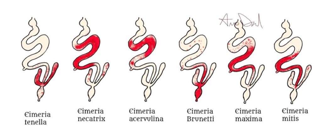 -Eimeria tenella: coccide più noto per la sua gravità, si localizza nei ciechi e causa diarree emorragiche in quanto si moltiplica coinvolgendo strati profondi della mucosa, gli animali si presentano pallidi, abbattuti e possono andare incontro a morte.