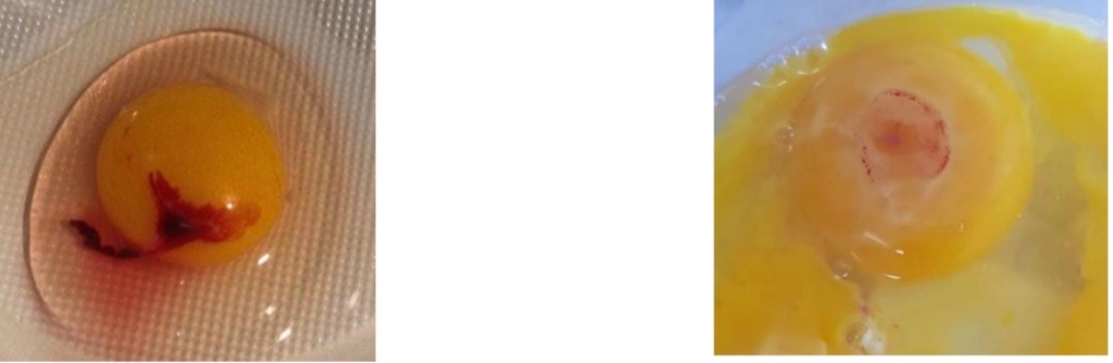 ➢ sangue → Piccole perdite ematiche dell’uovo non sono sempre da imputarsi a un embrione, infatti in caso di sviluppo è chiaramente visibile una piccola rete venosa complessa o una linea circolare di sangue con un tuorlo di colore alterato se il feto è morto. Normalmente il sangue rosso vivo presente è dovuto a rotture di capillari durante l’ovulazione o nel passaggio dell’uovo prima/durante la deposizione degli albumi. Se l’evento è sporadico non c’è da preoccuparsi, se la perdita ematica e marcata o una gallina ha sempre spesso questo problema è bene fare un controllo sanitario per escludere infiammazioni del riproduttore e valutare una integrazione alla dieta visto che la fragilità capillare potrebbe essere dovuta a carenze vitaminiche e di microelementi minerali.