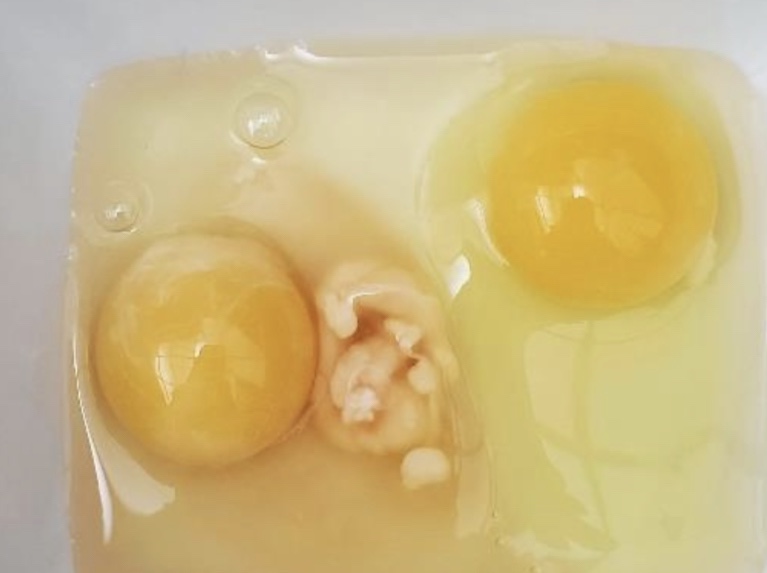 ➢ Tuorli multipli e uovo nell’uovo → Può capitare che la gallina ovuli due tuorli in contemporanea o in tempi ravvicinati, in questi casi questi scendendo lungo l’ovidutto subiscono il processo già descritto ma si ritrovano insieme nella camera del guscio dove vengono avvolti insieme in un unico uovo. Molto più raro è “l’uovo dell’uovo”, fenomeno in cui un uovo, spesso di piccole dimensioni o senza tuorlo) non venga deposto prima che un secondo raggiunga la camera del guscio, in questo caso il primo uovo resta intrappolato nel guscio del secondo.