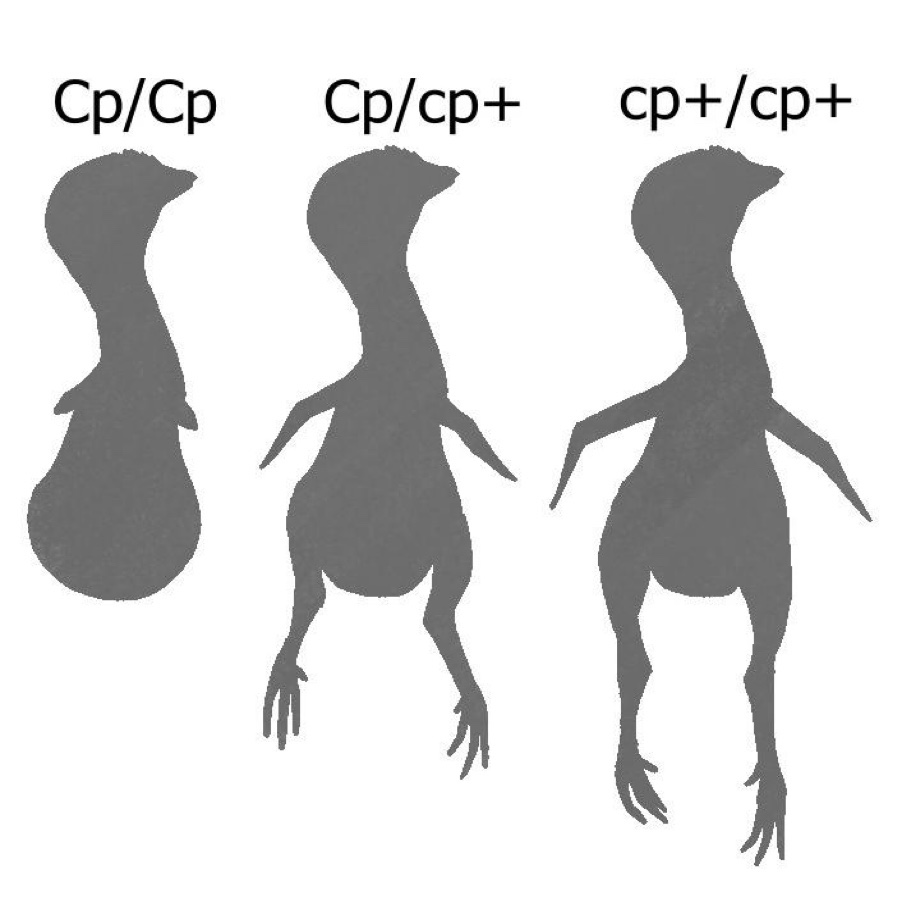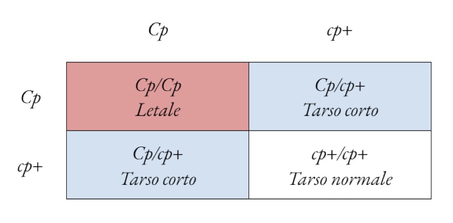 il 25% delle uova non schiuderà in quanto il gene sarà presente in omozigosi e, quindi, letale (Cp/Cp). Un 50% darà vita a soggetti eterozigoti Cp/cp+ che avranno il tanto ricercato tarso corto, mentre il restante 25% sarà omozigote per cp+, con arti di normali dimensioni.