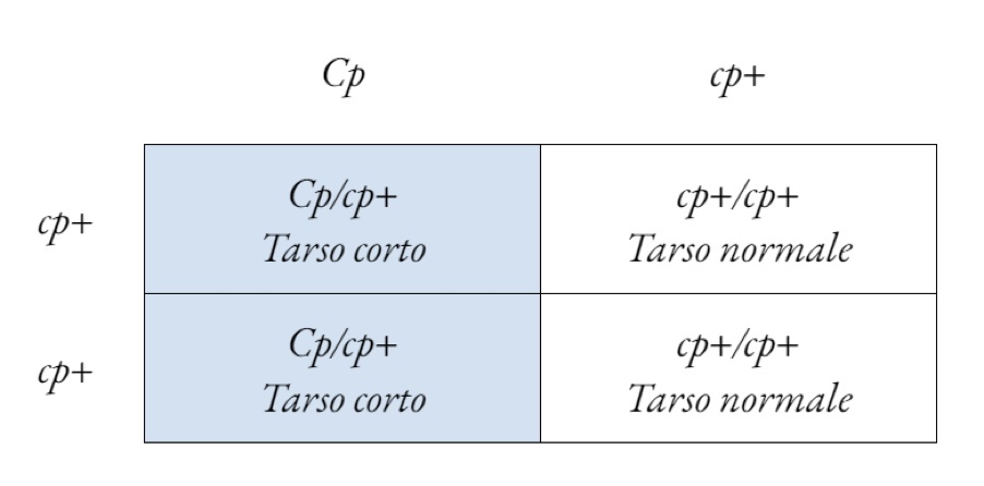 Da tale accoppiamento, come è possibile vedere nel quadrato di Punnet sottostante, si evita di portare in omozigosi il gene Cp con relativa perdita di embrioni. Così facendo si avrà una percentuale di soggetti a zampe corte del 50% e di soggetti a tarso normale anch’essa del 50%.
