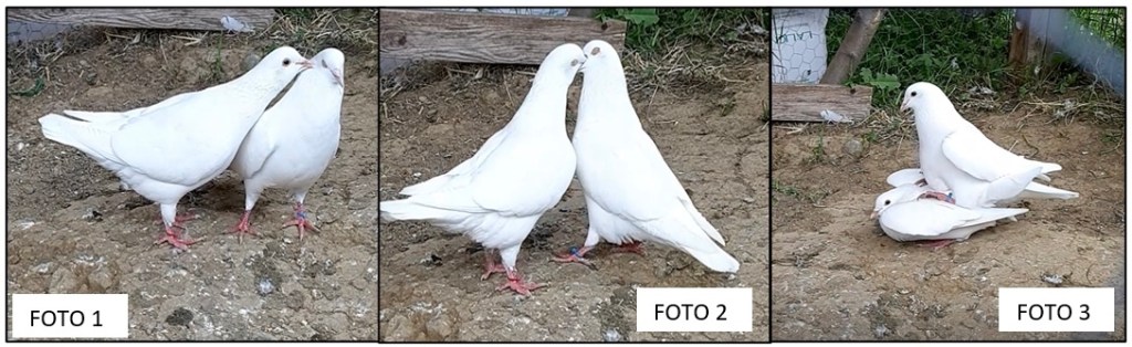 Inizialmente la femmina è sfuggevole ma, se ci fosse sintonia tra i due volatili, inizia a cercare il becco del compagno fino a inserirvi il proprio, il maschio a questo punto rigurgiterà del latte di gozzo per la femmina (poltiglia caseosa che tratteremo meglio più avanti). Questo schema si ripete per qualche volta fino a che la femmina si “accovaccia” accettando la copula ed il maschio sormontandola porta a termine l’atto riproduttivo. Ciò non si manifesta solo al primo accoppiamento ma si ripete ogni volta che i due colombi tentano di riprodursi.