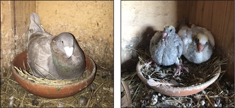 a sinistra riproduttore in cova sulle uova, a destra coppia di pulli di 2-3 settimane