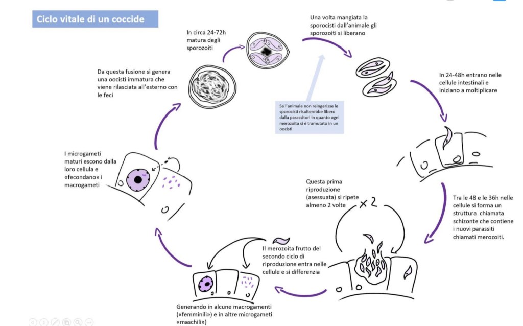 In breve i coccidi sono Protozoi, tipicamente organismi unicellulari. Quelli di interesse veterinario sono parassiti obbligati che sfruttano le cellule intestinali per nutrirsi e riprodursi; facendo questo portano al danneggiamento della cellula stessa con sua conseguente morte.