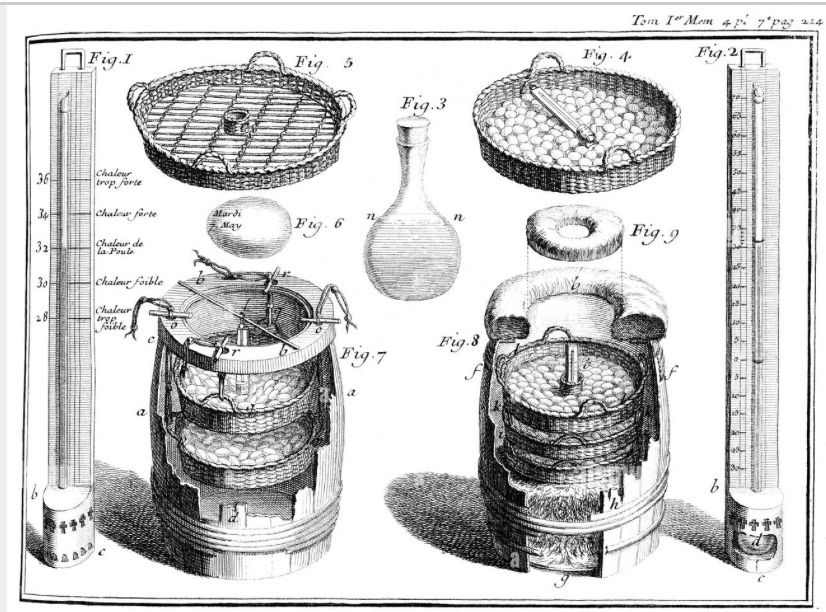 La prima incubatrice artificiale in Europa fu inventata nel 1749 dal fisico René Antoine Ferchault de Réaumur in Francia a Parigi e scrisse un volume intitolato “L’arte di covare e allevare uccelli domestici di tutte le specie in tutte le stagioni, sia per mezzo del calore del letame sia per mezzo del fuoco ordinario“