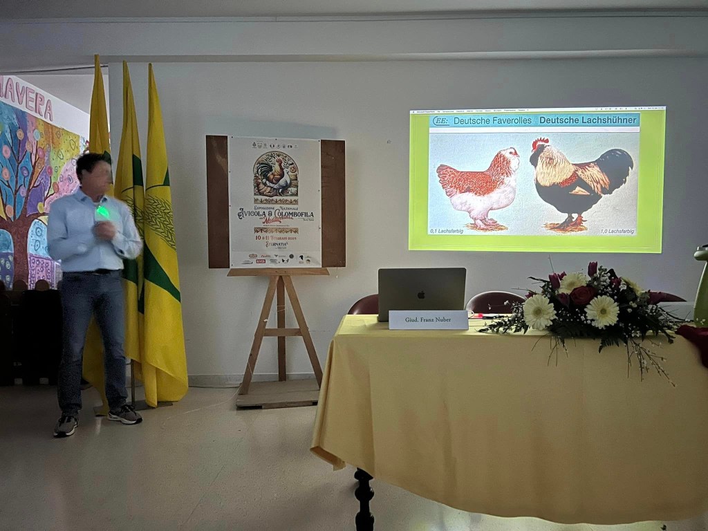Infine parla il professor Camarda facendo un quadro molto dettagliato sulla gestione del Pollaio Amatoriale e tutto quello che c’è da sapere riguardo le malattie più comuni e i possibili rimedi che riguardano i nostri polli! Dopo una breve pausa (Accompagnata dalle Orecchiette alle cime di Rapa e un buon bicchiere di Primitivo), verso le 17 , con la sala ancora colma di appassionati, ha preso la parola il giudice tedesco Franz Nuber che ci ha presentato alcune razze avicole storiche tedesche, e per ultima, la biologa Maria Elena Perrone, ha affrontato l’importanza dell’uovo nell’alimentazione.