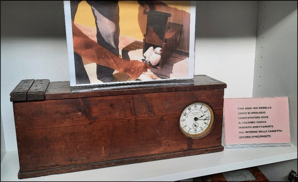 Ovviamente le profonde conoscenze in ambito colombofilo ereditate dal mondo militare e la passione in merito di tanti allevatori si sono ribaltate successivamente in un contesto sportivo (l’allevamento dei colombi ad uso privato era principalmente per autoconsumo, in Italia solo il Ministero della Guerra, a supporto degli strumenti di comunicazione, era interessato alla messaggistica con i Colombi Viaggiatori): mentre nei conflitti bellici era fondamentale che il colombogramma fosse recapitato e la differenza di pochi secondi non faceva la differenza, in gare competitive il tempo di raggiungimento della destinazione assumeva un’importanza cruciale. Quindi il percorso per gli allevatori fu quello di selezionare colombi sempre più performanti ed affidabili, mentre per i giudizi implementare strumenti di misurazione sempre più precisi. Si svilupparono e migliorarono nel tempo così gli orologi di rilevazione ufficiale, dove i colombi erano inseriti (vedi foto sotto) al momento dell’arrivo alla colombaia ed in seguito al blocco dello sportello di inserimento, attraverso meccanismi specifici su cartoncini rotondi, era segnato l’orario di arrivo. Per evitare manomissioni ogni colombo era dotato dell’anello identificativo irremovibile (come oggi) e di un anellino in gomma removibile, da inserire nel meccanismo stesso.