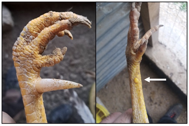 nella gallina (destra) è presente solo un accenno di sperone (freccia)