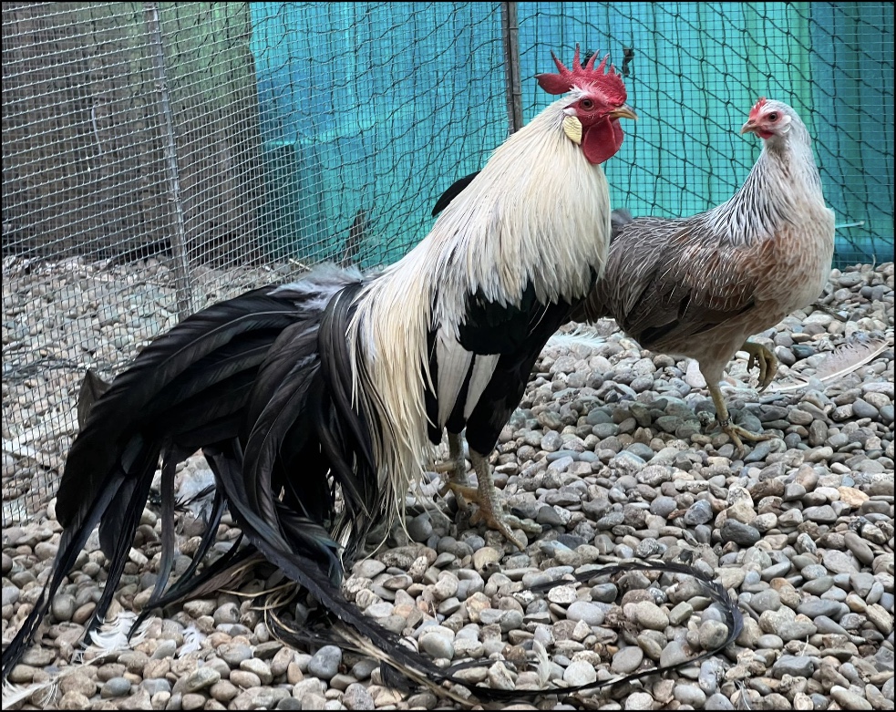 Gallo e gallina di razza Onagadori colorazione selvatico argento