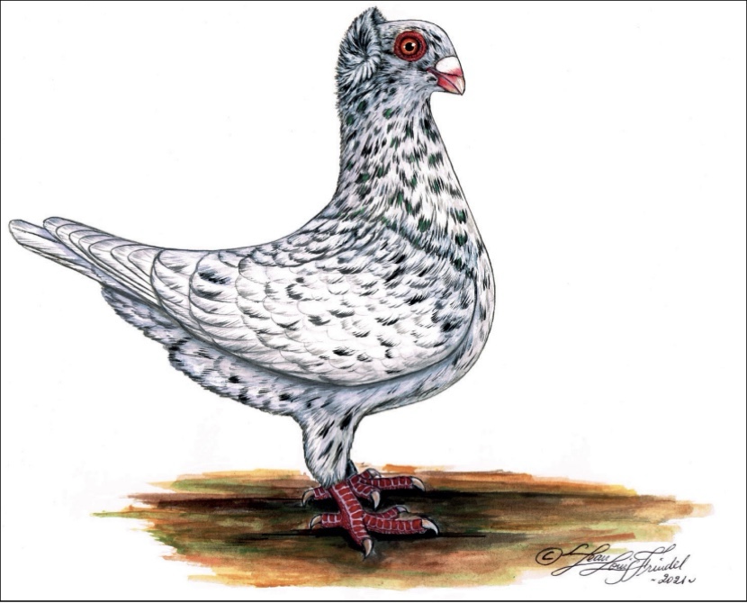 Ovviamente se si confrontano queste due immagini con il disegno dello standard attuale la differenza è evidente, ma non dobbiamo dimenticare che questi disegni storici affondano in una passato di oltre 600 anni, tempo durante il quale volatili come i colombi hanno subito, soprattutto per mano dell’uomo, moltissime variazioni, anche sostanziali. Il ciuffo, il becco e la forma sono comunque elementi che sembrano un filo comune che lega nel tempo passato e presente.