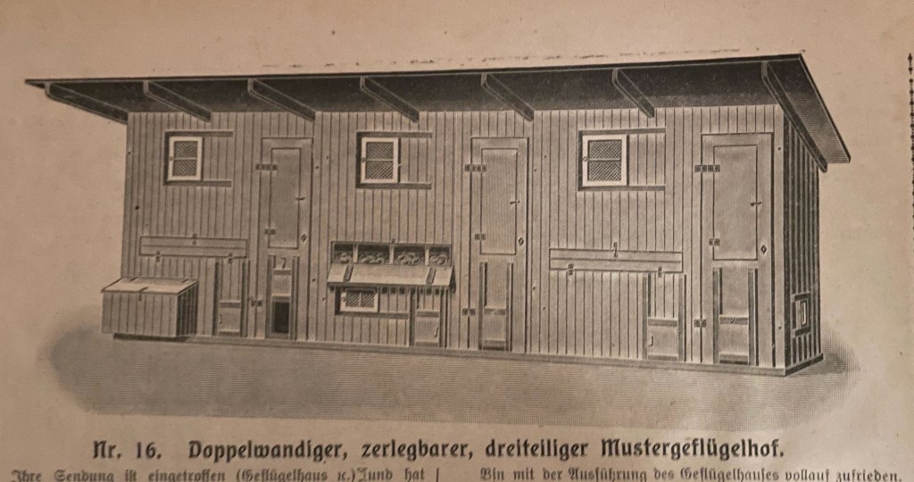 Raffigurazione anni 1930 di un pollaio a tre sezioni, si può notare i diversi accessori per aiutare l’allevamento (foto catalogo allevamento “Seflügelhof a Mergentheim”)